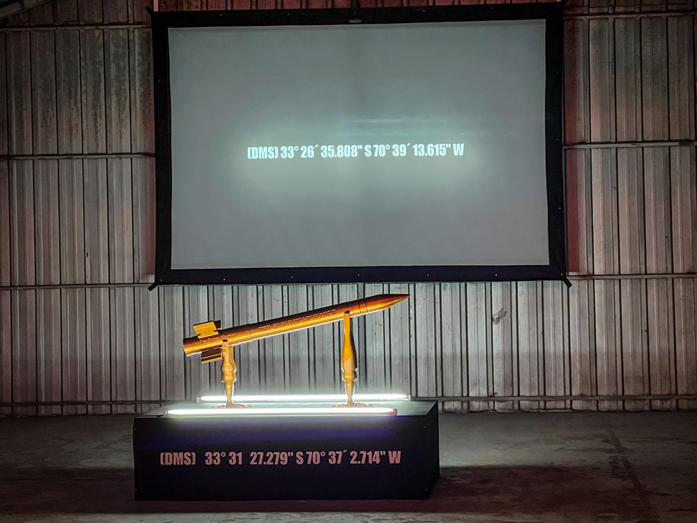 El texto numérico presente en la pieza audiovisual proporciona datos de geolocalización del Palacio de la Moneda y de la población San Gregorio, lugares que fueron bombardeados siendo testigos de la represión y el sufrimiento infligidos por el régimen dictatorial. Estos datos están atravesados por un Tinnitus, un zumbido persistente que combina estruendo y silencio. Esta representación sonora crea una conexión simbólica con las formas de represión utilizadas en las poblaciones durante la dictadura, especialmente a través del vuelo de aviones y helicópteros a baja altitud que generaban miedo y terror en la población por medio del sonido. La instalación también acopla una escultura del cohete SURA escala 1:1, que utilizaron los Hawker Hunter en el bombardeo el día del golpe, la obra hace comparecer estruendo y silencio y da cuenta del terror de estado por medio de la representación de la violencia.